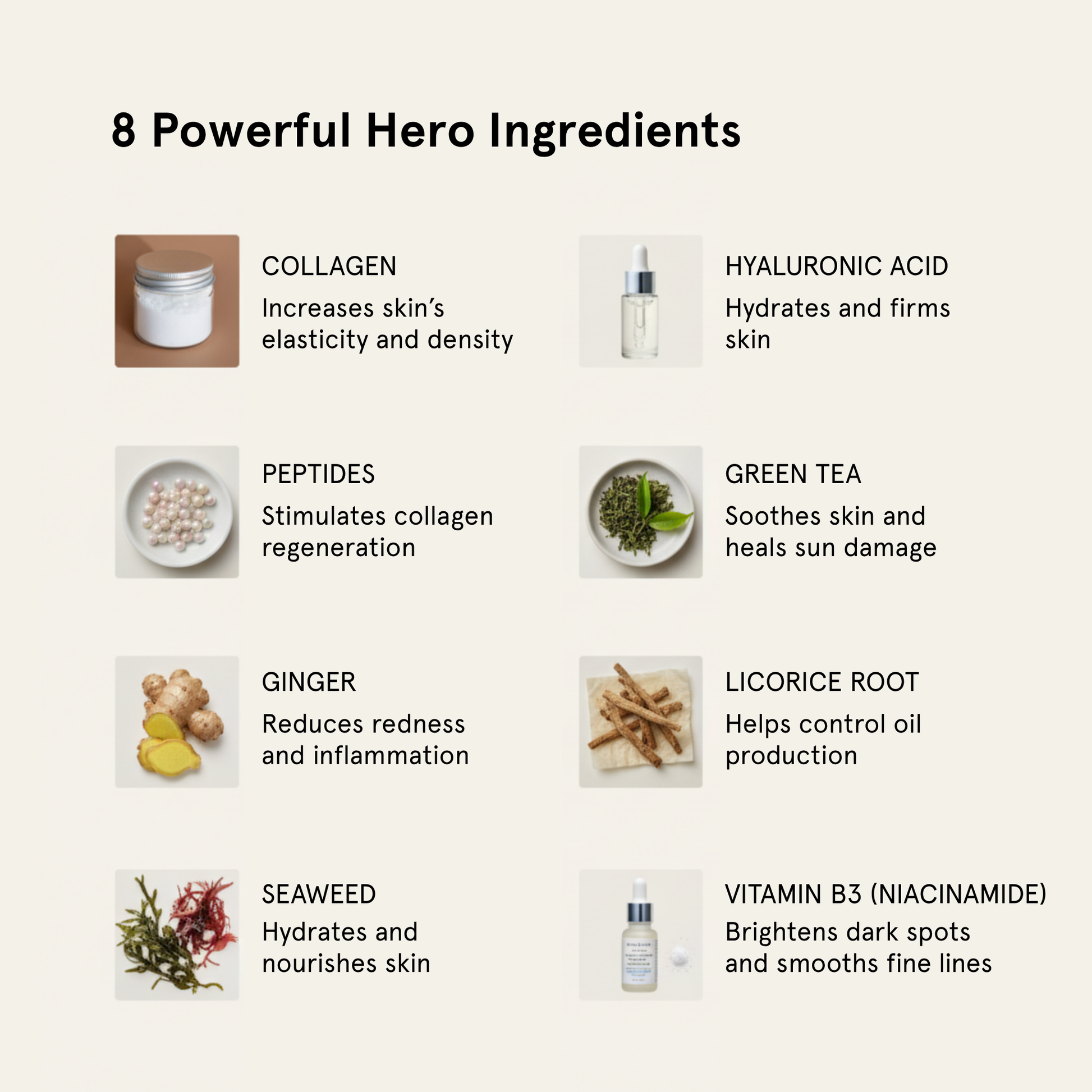 Hero ingredients: Vitamin B3 (Niacinamide), Collagen, Hyaluronic Acid, Peptides, Green Tea, Ginger, Licorice Root, Seaweed.