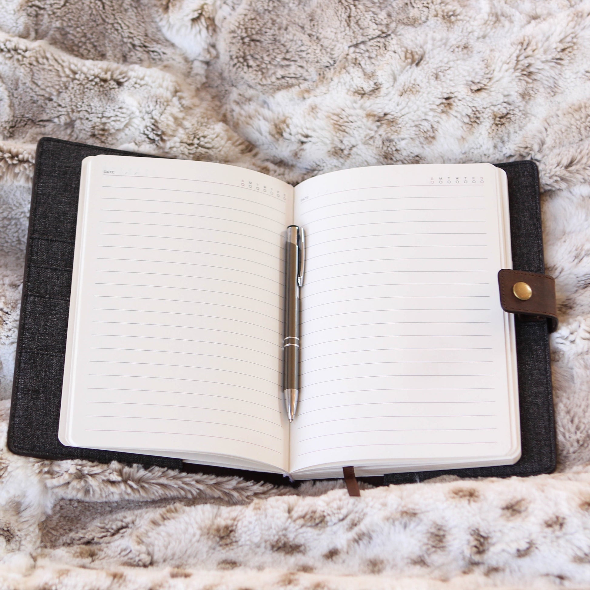 Sure to be a staple item in your everyday essentials. This journal is covered with beautiful full-grain cow leather. The Bucksaw leather journal is the perfect gift for anyone that loves writing, journaling, or documenting frequent business notes or ideas. The cover comes with one lined A5 insert. This fresh design features a brass snap button enclosure and a hidden pen loop that prevents you from ruining the spine of your journals. The inside is lined with a beautiful herringbone material that features four front card slots that are perfect for business cards, owner name cards, or credit cards. Store notes or reference papers in the large pocket on the back panel. Last but not least, this journal is refillable, so when you've used all of the pages, swap out the insert for another compatible A5 sized journal insert.