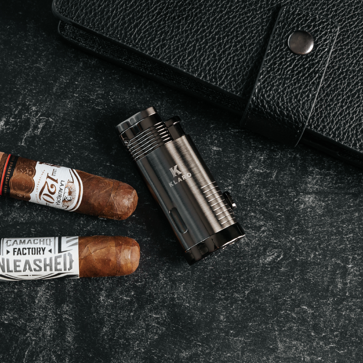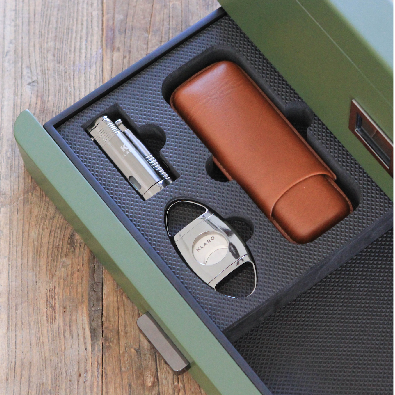 Introducing the Gun Metal Edition accessory kit by Klaro. Included is one triple-torch wind-proof cigar lighter and one matching double guillotine stainless steel cutter. We’ve carefully crafted the metal plating to be a modern polished gunmetal finish. While this accessory kit will comfortably fit into any of our Klaro humidor drawers, it was specifically designed to fit into the new Military Humidor drawer foam by Klaro. It’s time to elevate your cigar smoking experience with this top-notch cigar accessory kit.