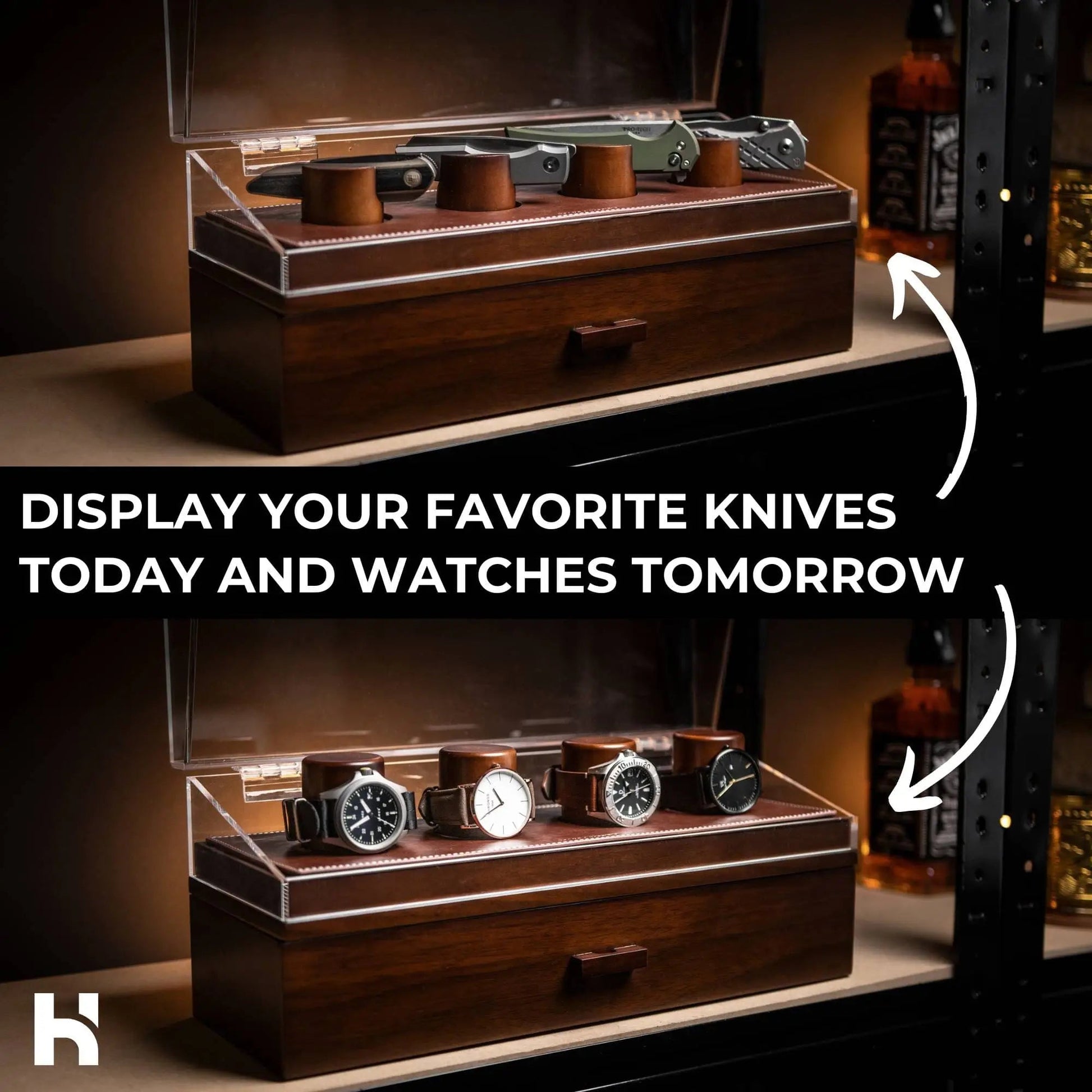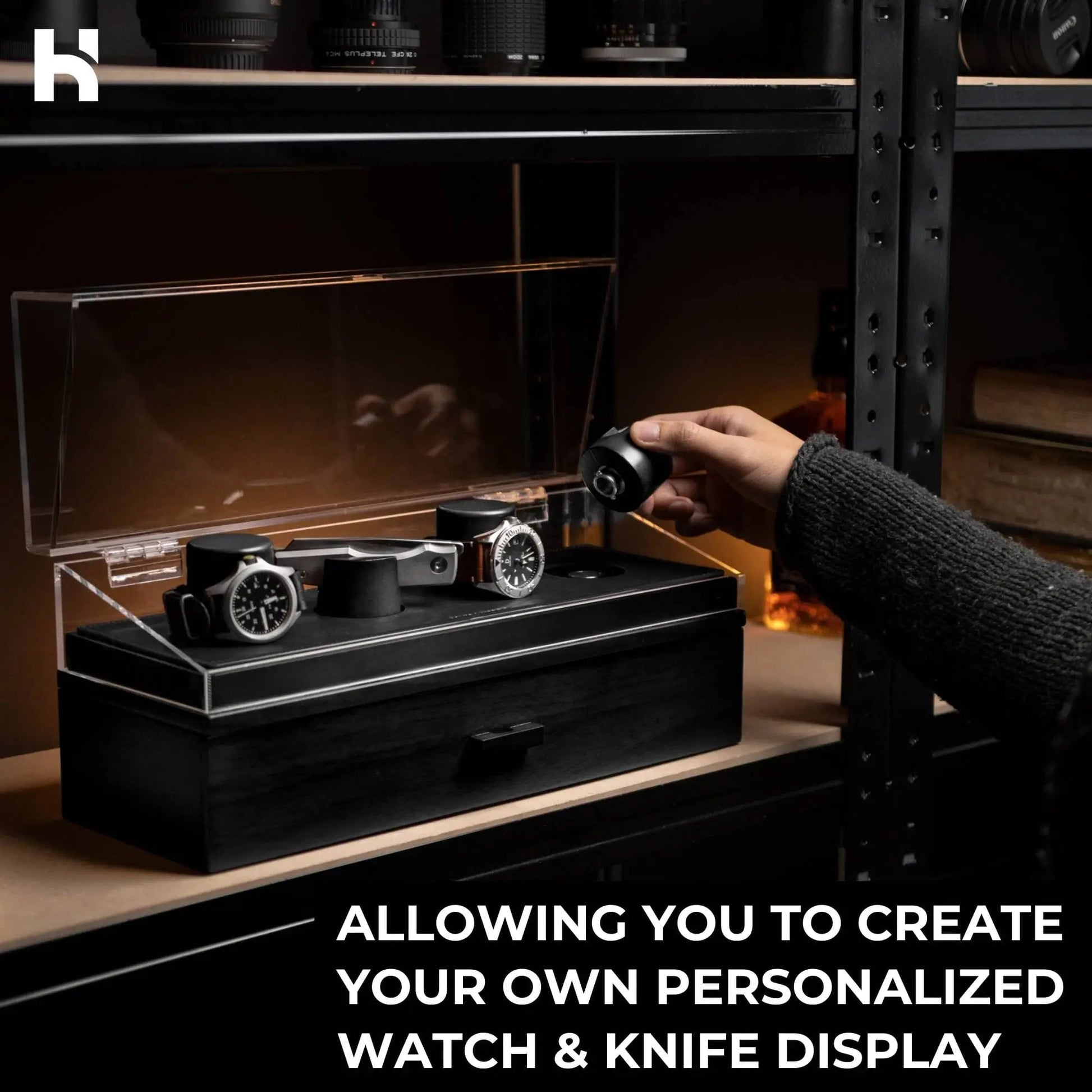Create a display that truly reflects your style and passion by arranging the pillars in any configuration you desire. Showcase watches and knives. The modular design of the Combo Deck allows for seamless integration of these extra pillars, giving you the freedom to curate your perfect display.