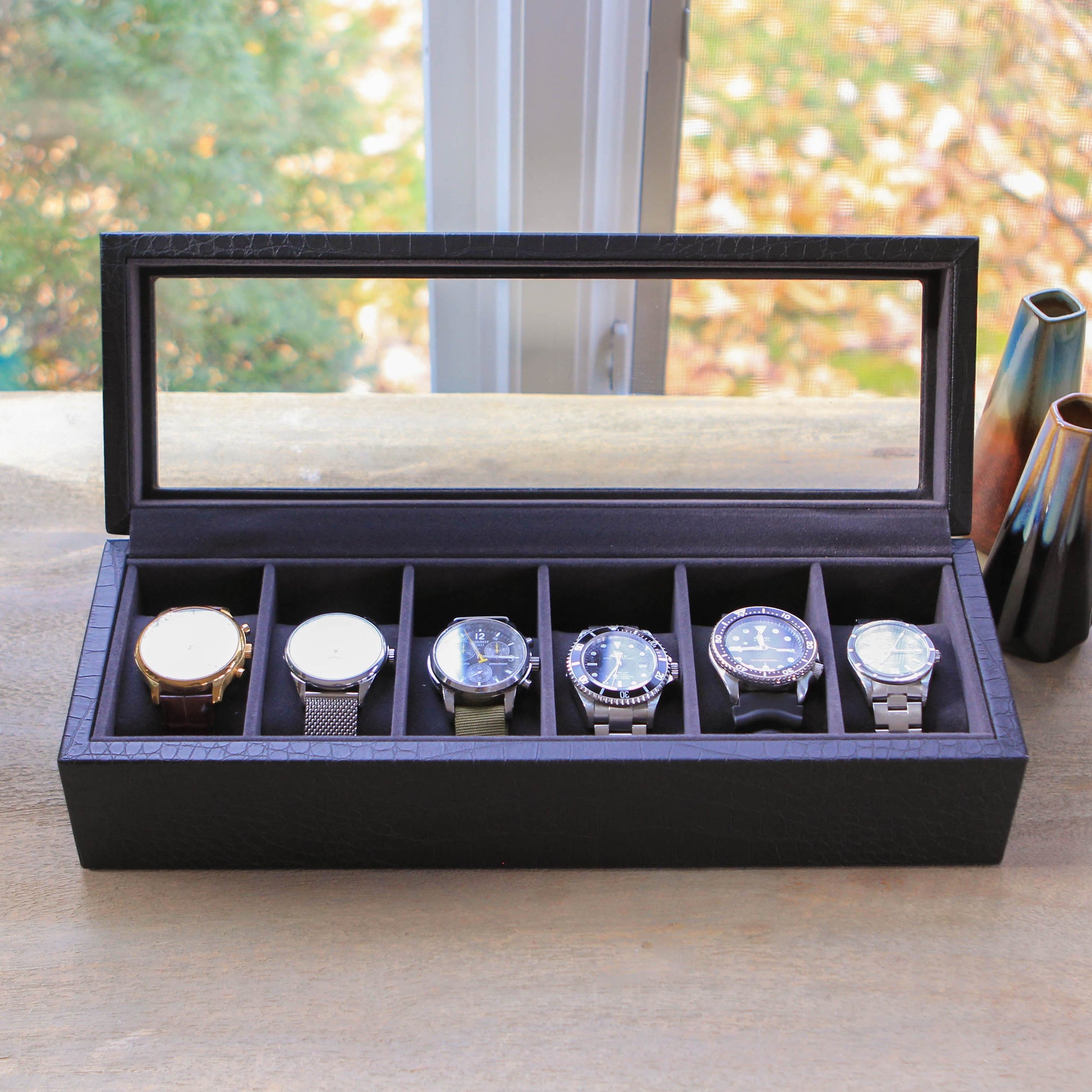 Safely store up to six watches. The natural softness of the faux leather will prevent any scratching of furniture surfaces. We’ve added real tempered glass with solid wood construction.