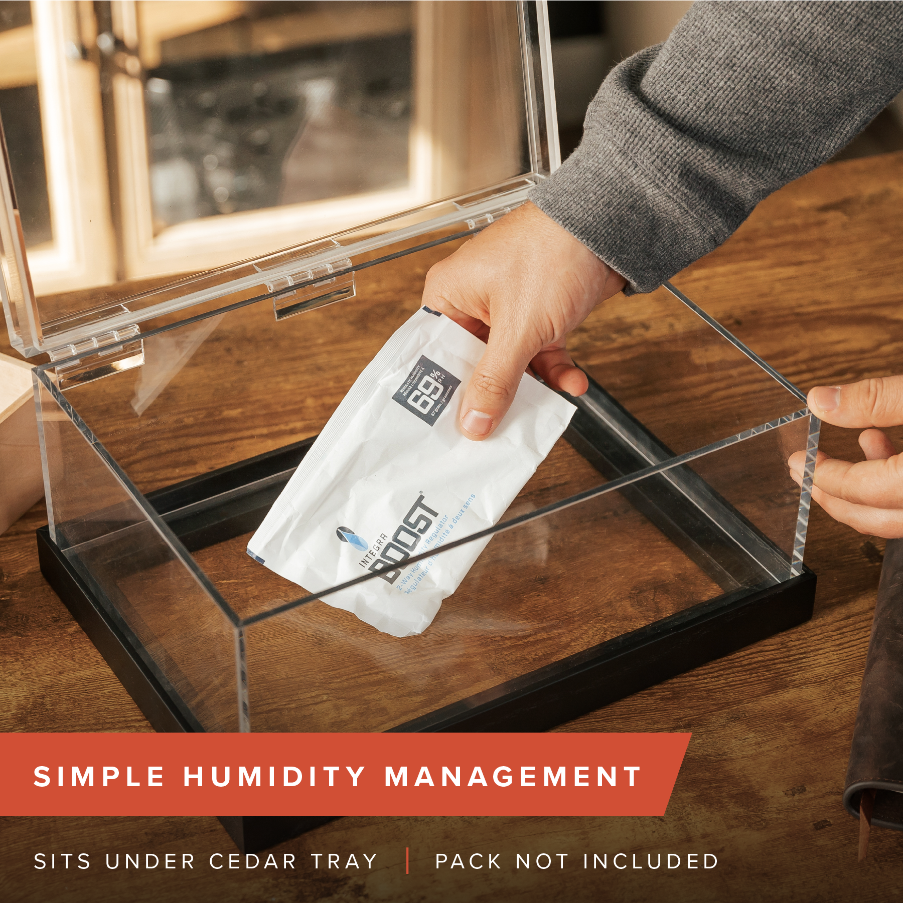 Begin your cigar storage journey with ease right out of the box for two-way moisture control. Just place it underneath the Spanish cedar wood tray and let it work its magic, offering a hands-off approach to humidity control. -