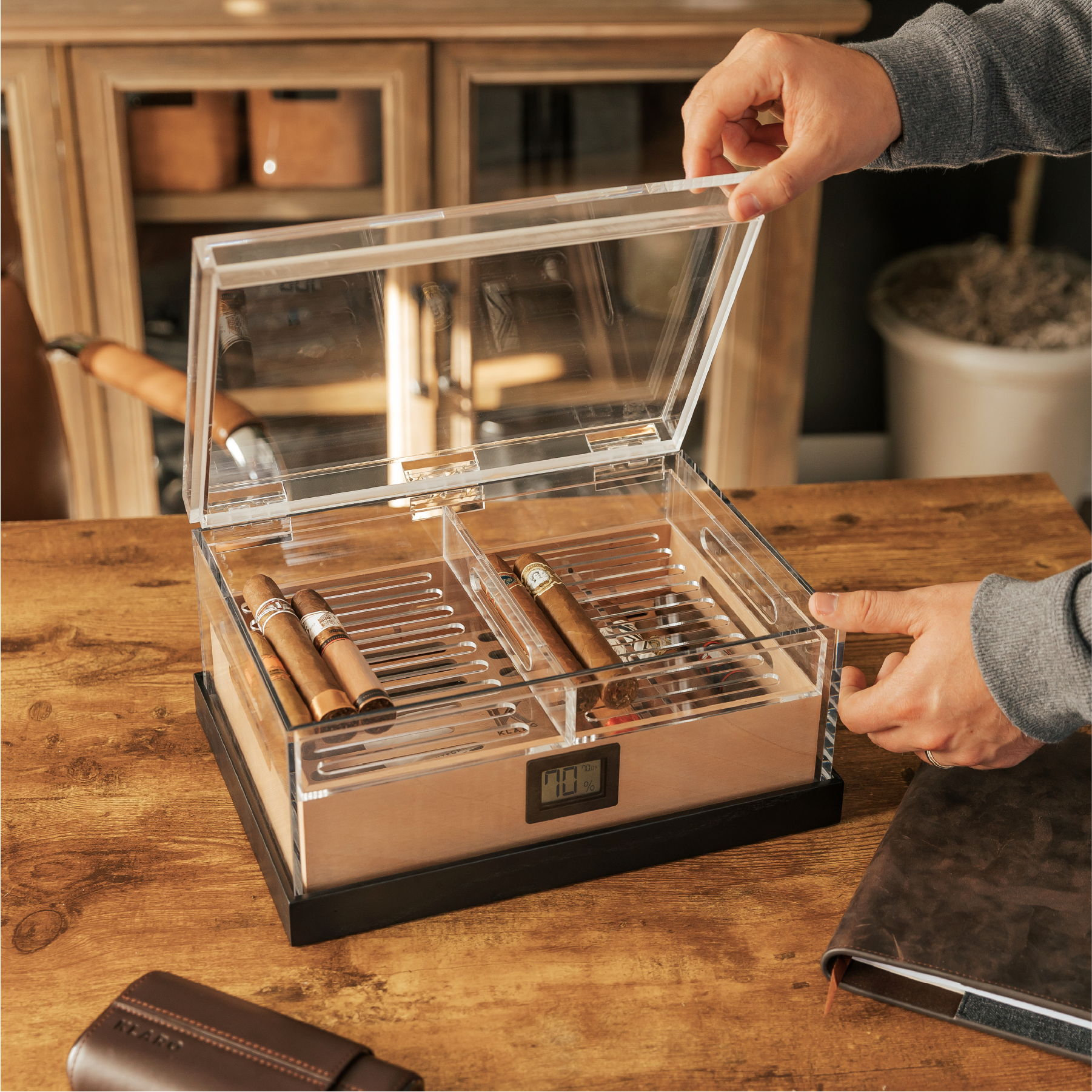 The Felix Pro Humidor sets the standard with its air-tight seal, achieved through precision-cut acrylic that fits seamlessly together. The additional acrylic lip on the lid fortifies this seal, ensuring your humidity levels are consistent and controlled. -