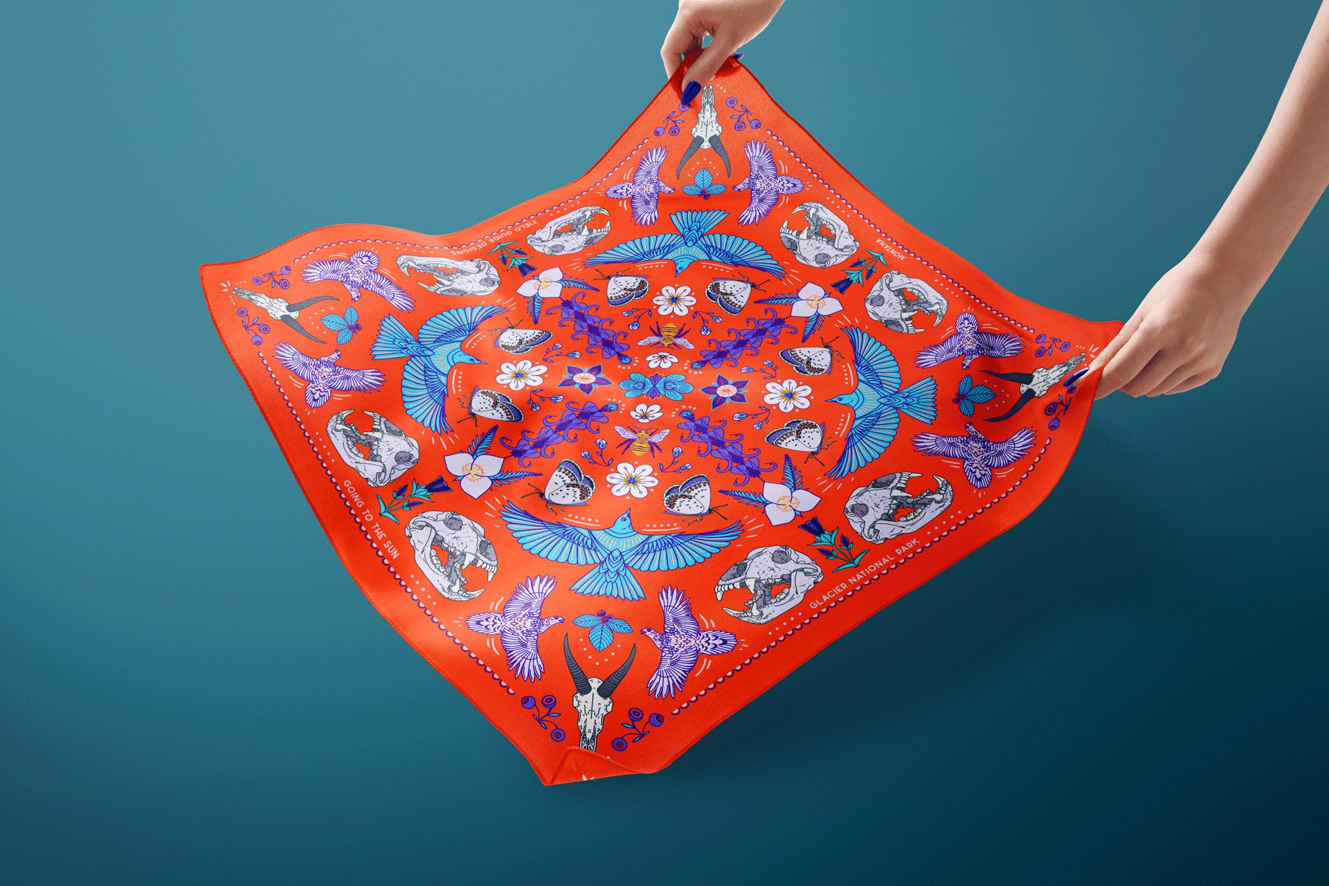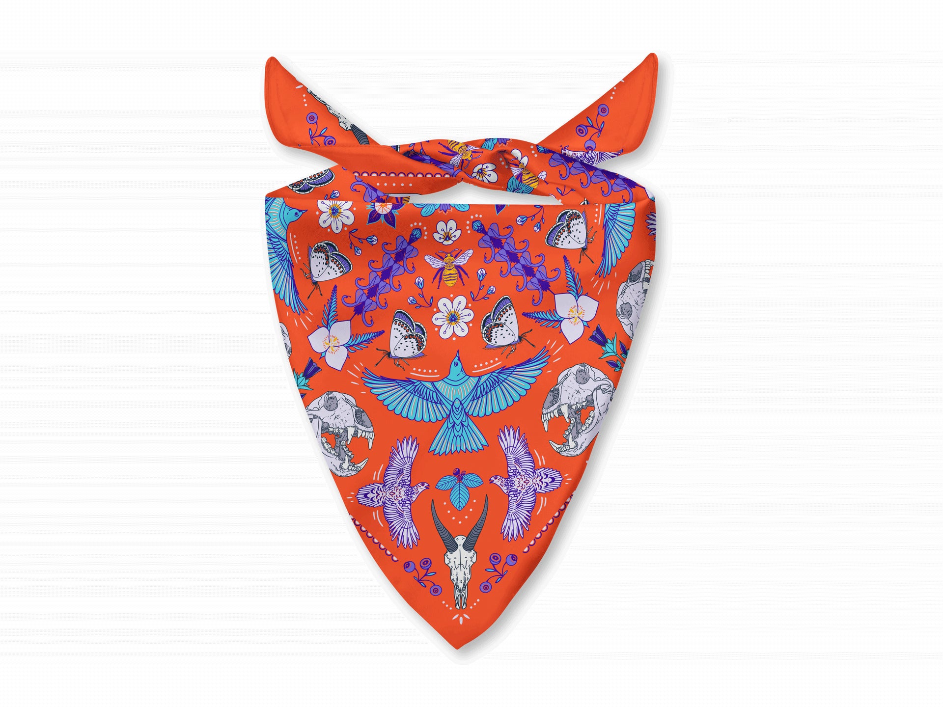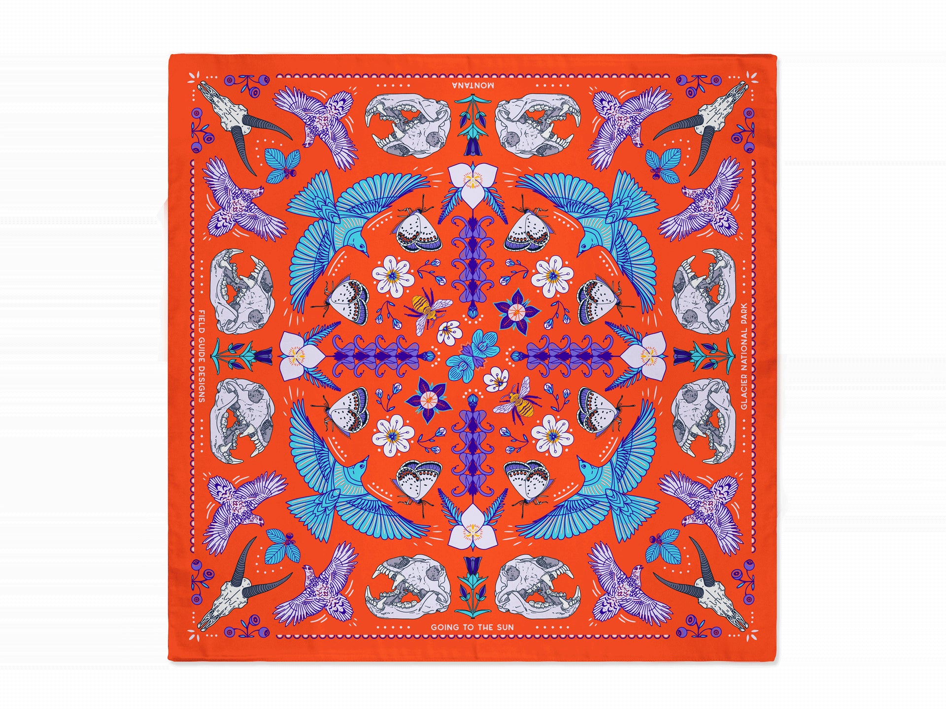 This scientifically illustrated bandana is the perfect way to carry the essence of a place with you wherever you go. The design is inspired by the flora and fauna that thrive along this 51-mile stretch of road through Glacier National Park. This famous road straddles the continental divide, covering vast distances across the park. It passes by forests, cliff-sides, waterfalls, lakes, glaciers, meadows, and stunning views. Home to over 71 species of mammals, 276 species of birds, and 1,990 species of plants documented.