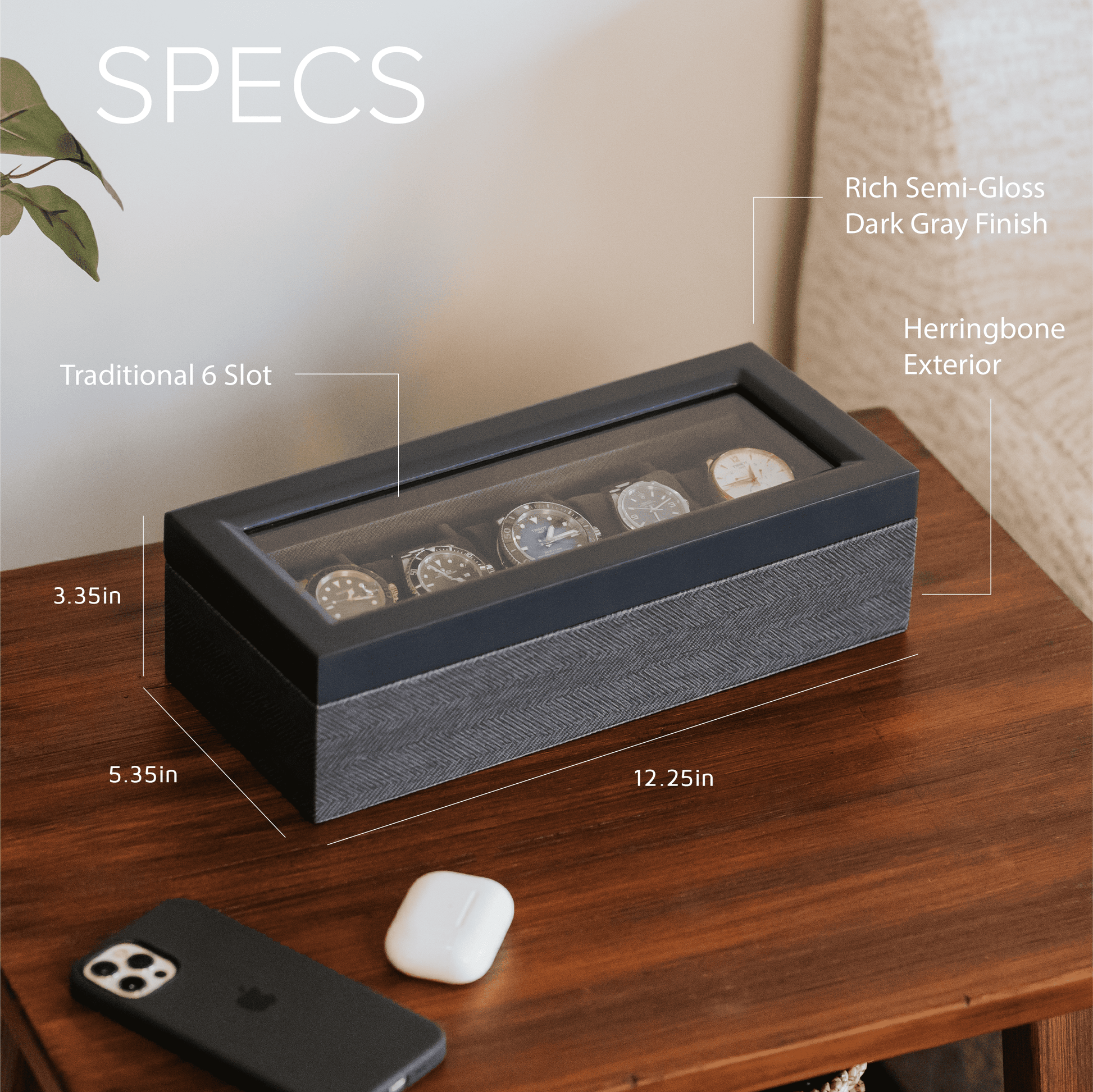 STRIKING DESIGN - The proper storage for your best watches. Our unique new 2-toned modern design pairs a dark grey solid wood lid against a vegan leather herringbone texture.