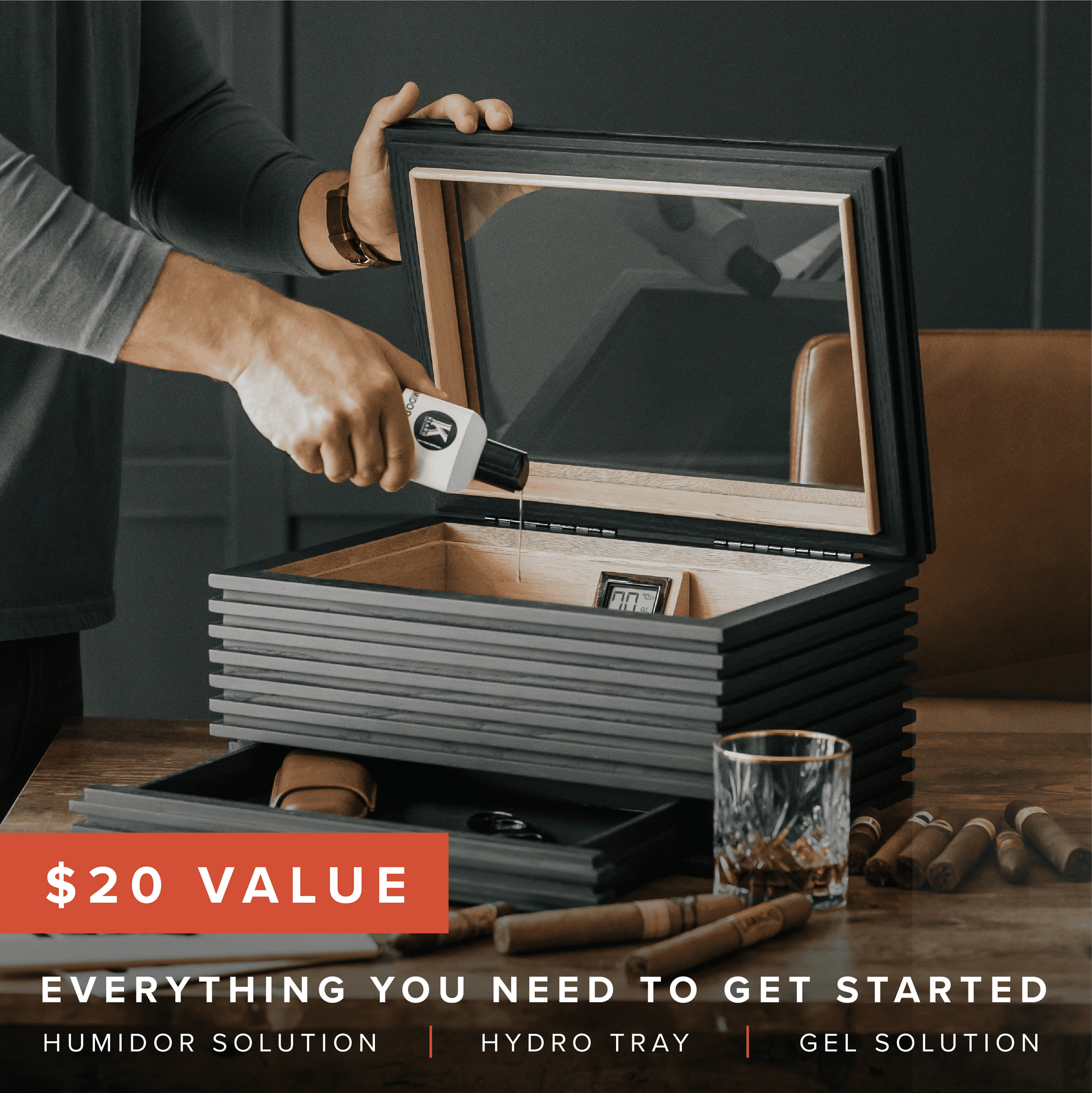 Introducing the KOBI Glass Top Humidor by Klaro. This large humidor boasts a one-of-a-kind exterior with slatted wood paneling that blends the humidor lid and accessory drawer. A precise digital hygrometer sits in a movable wood holder with an angeled view, making it easy to see the humidity inside your humidor without opening the lid. Unlike the competitors, the inside is lined with 5mm thick solid cedar walls that lock in humidity, making your cigar storage effortless. While the other guys give you little to nothing, we've included everything you need to get up and running with your new Klaro humidor. We include our custom patent-pending Hydro System, which comes with a humidification tray, one bottle of regular Humidor Solution, and one bottle of Winter + Dry Climate Humidor Solution Mix. At Klaro, you are never left wanting more out of the box.