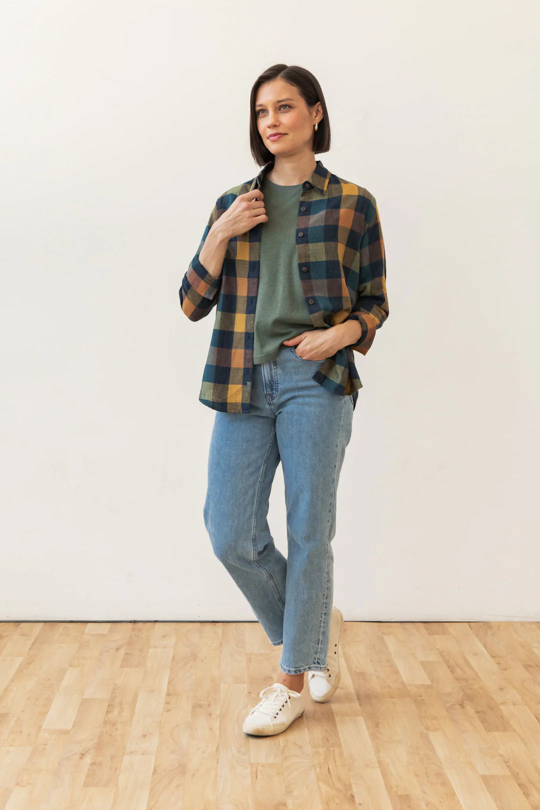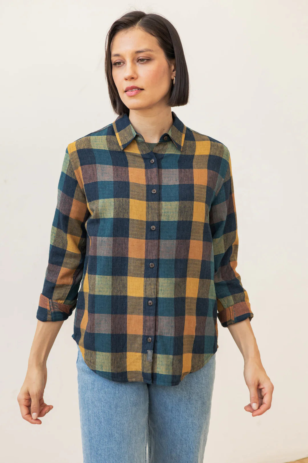 Classic button-up in a modern slim fit. This plaid is made from a soft recycled blend with a unique texture and nice drape.