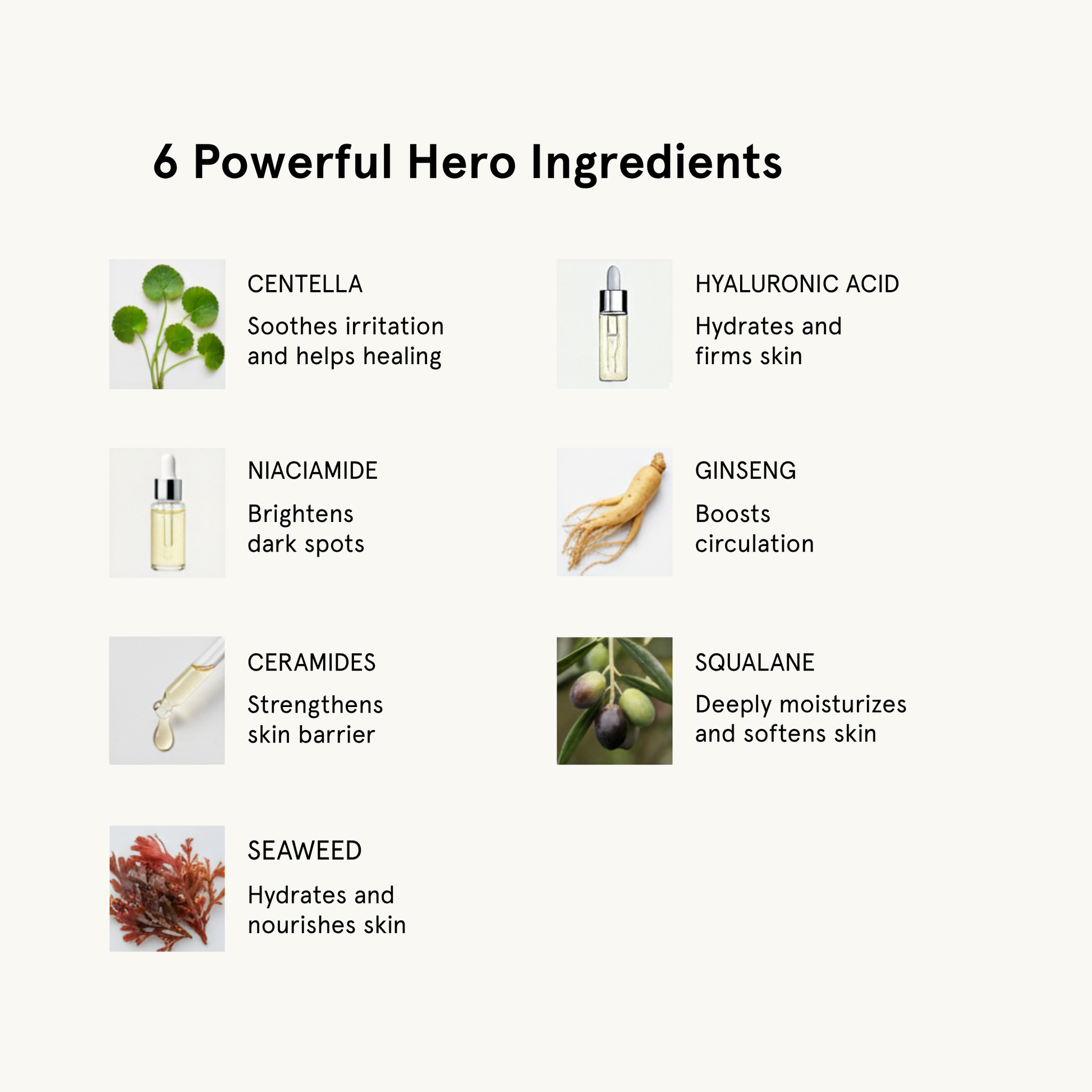 Hero ingredients: Centella Asiatica, Niacinamide, Ceramides, Hyaluronic Acid, Squalane, Ginseng, Seaweed.