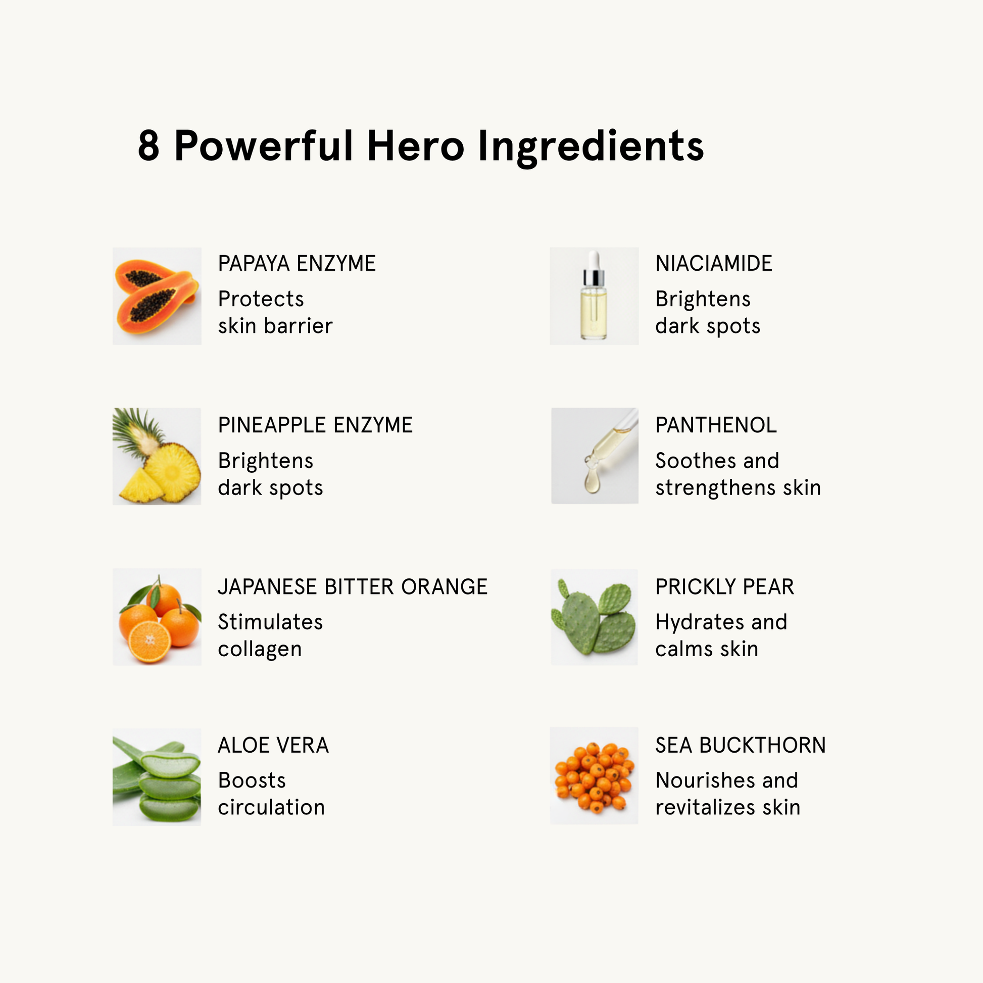 Hero ingredients: Papaya Enzyme, Pineapple Enzyme, Niacinamide, Panthenol, Aloe Vera, Sea Buckthorn, Prickly Pear, Japanese Bitter Orange (please see picture for full ingredient list).
