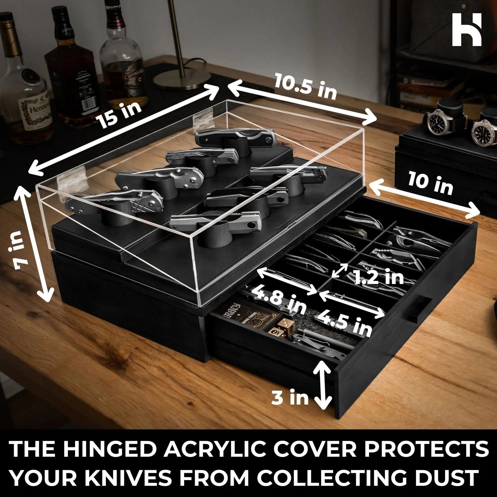 Your Favorite Pocket Knives on Display — Stop storing your knives in zip-up wallets or shadow boxes, and start displaying them with pride. This display case for knives offers 7 posts to showcase your most adored knives up to 5 ¾ inches. The patented two-tier design includes a drawer to store additional knives, small tools, EDC gear, and 12 additional blades up to 5 inches