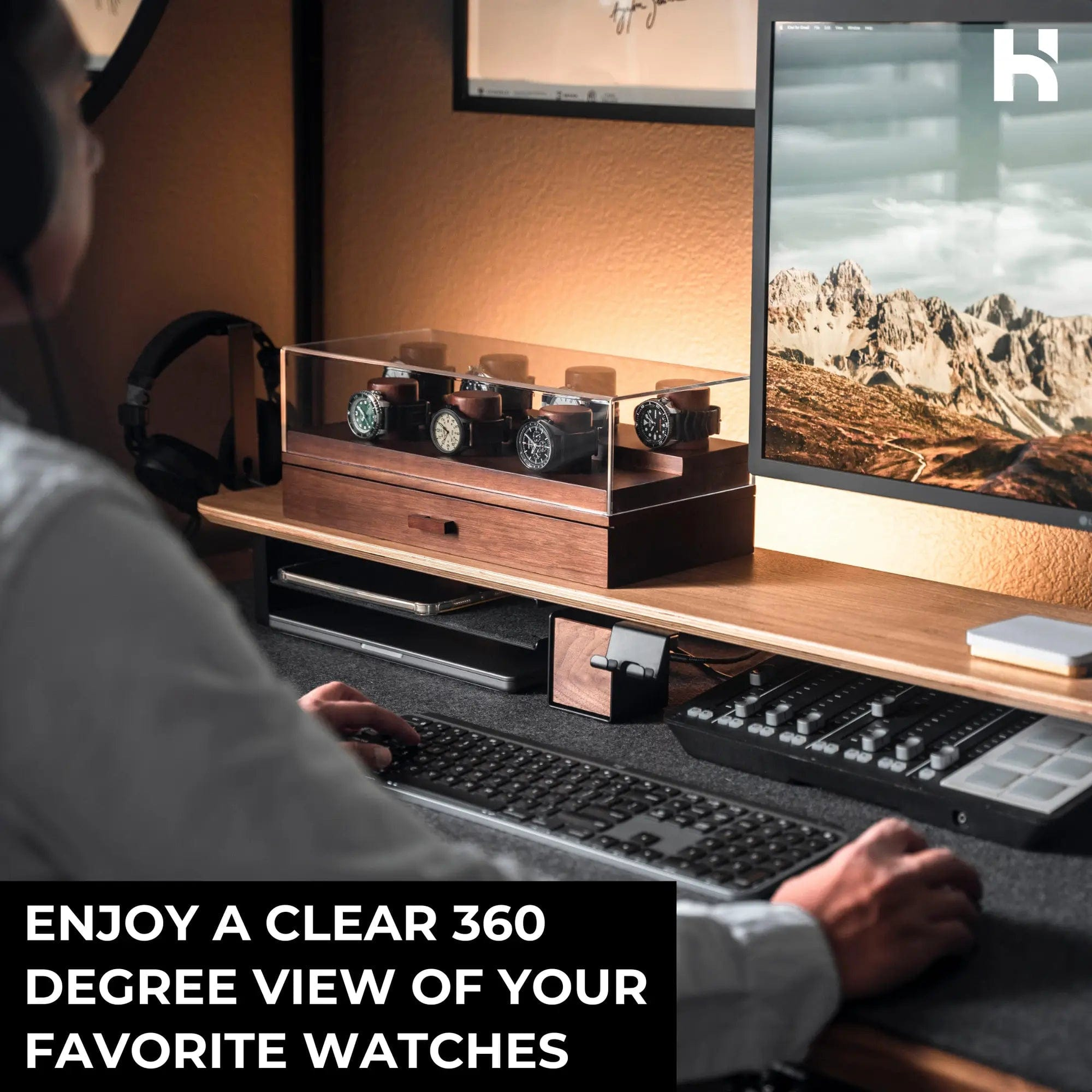 With the innovative two-tier platform, you can now organize and display 7 watches in our collectors watch box. The smooth running drawer contains 6 compartments for all of your accessories, including your watch straps / bands, AirPods, wallet, coins, cards, hopes and dreams.