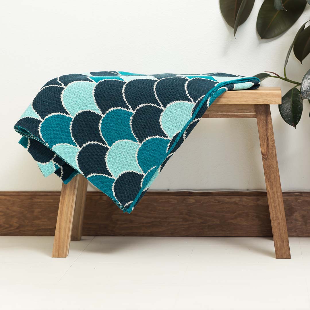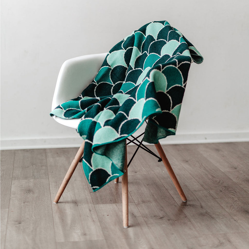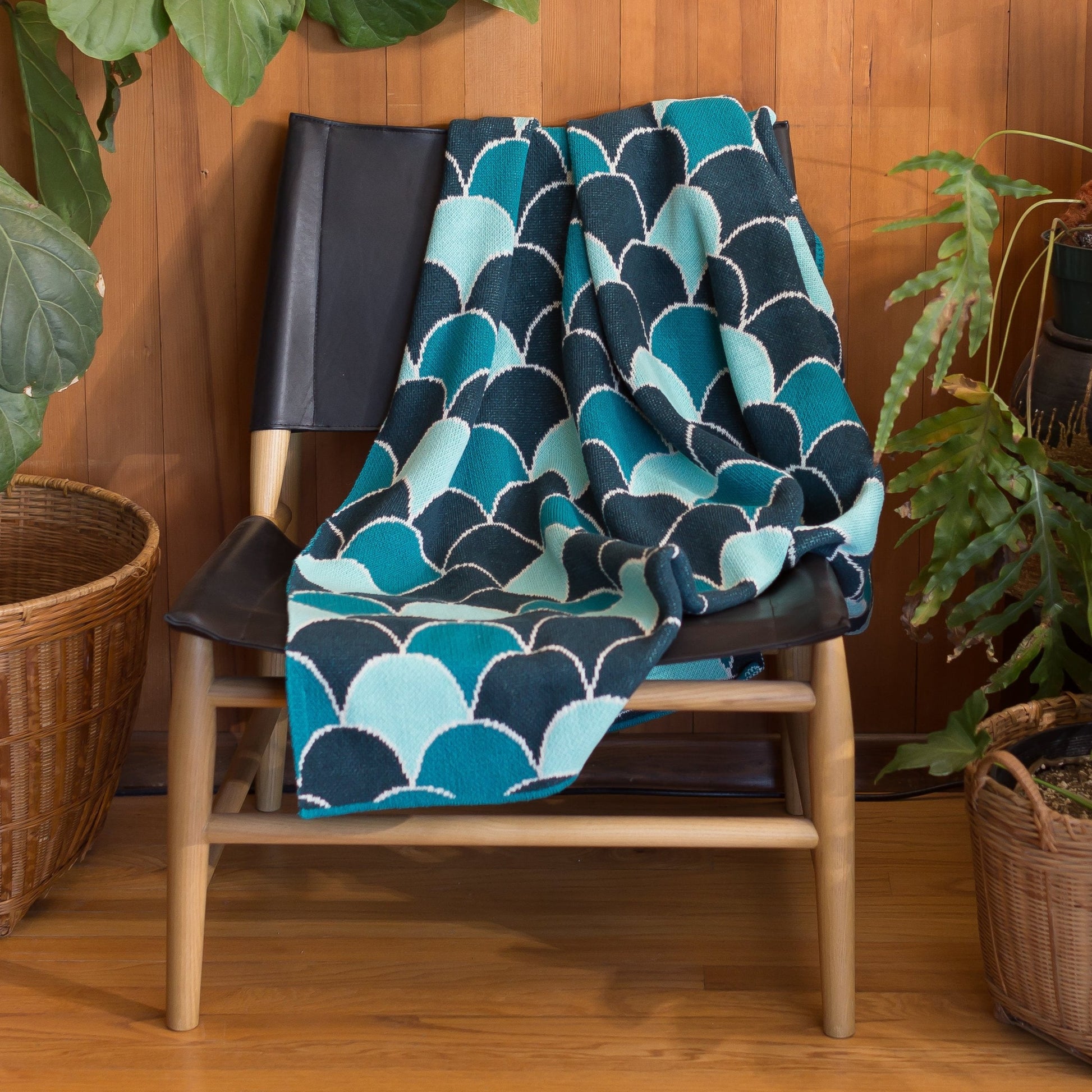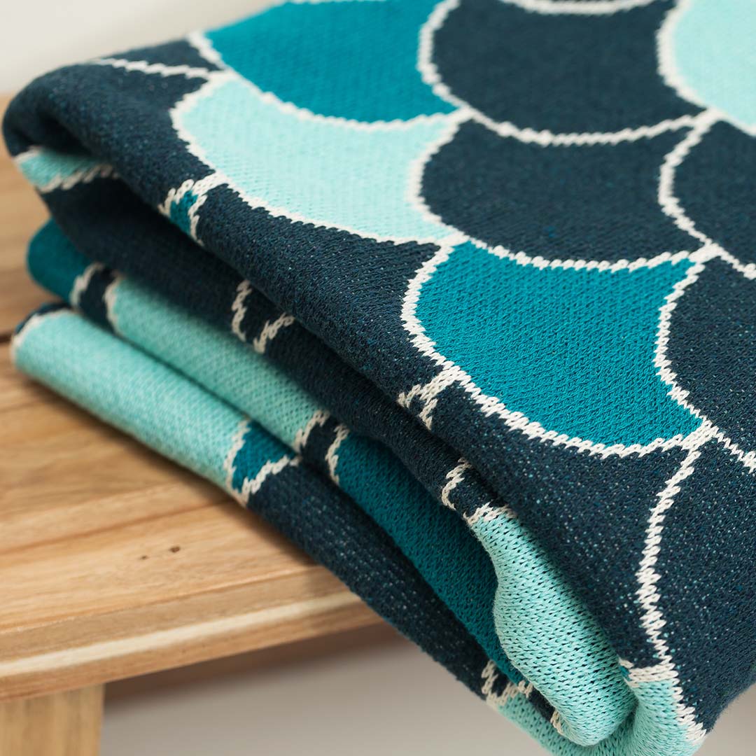 The Zellige Throw, inspired by the intricate patterns of handmade Moroccan tiles, adds a touch of exotic charm to any room. Its oceanic scallop design stands out beautifully against lush greenery, creating a cozy, enchanting atmosphere. Perfect for curling up with a good book or letting your mind wander to distant shores.